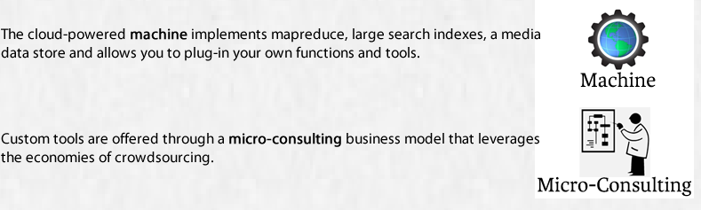 The cloud-powered machine implements mapreduce, large search indexes, a media data store and allows you to plug-in your own functions and tools.
